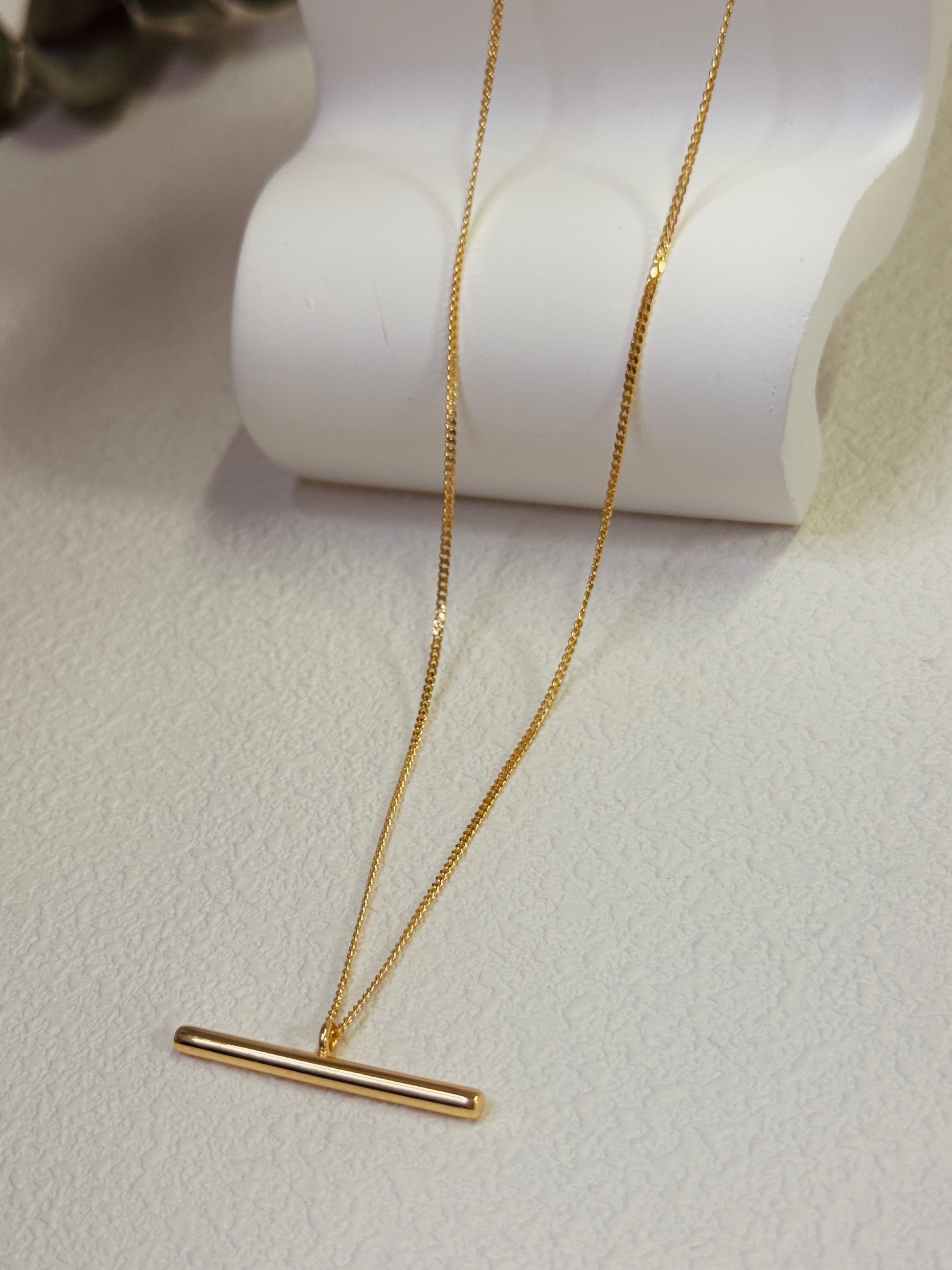 Sleek and sculptural, the Lineform Necklace features a polished horizontal bar suspended from a fine box chain — simple in form, powerful in silhouette.